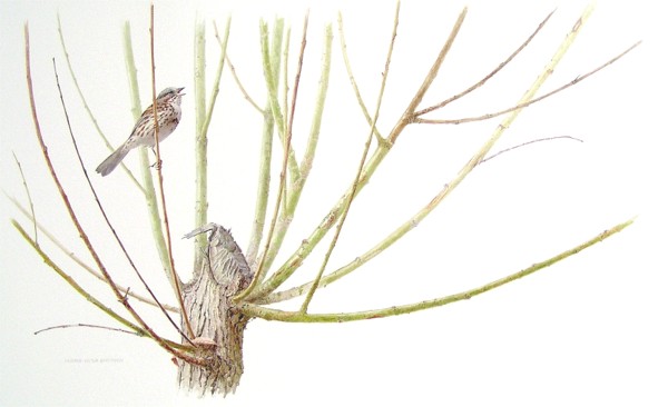 Gnawed tree stump with Song Sparrow